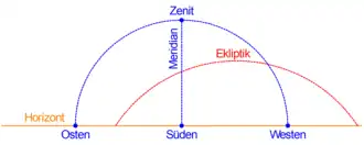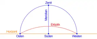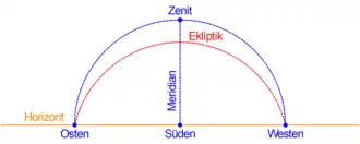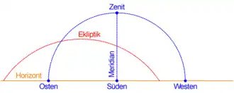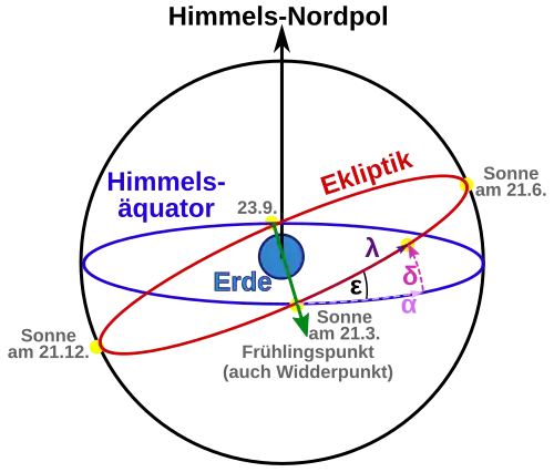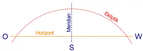 When observing the orbits of the fixed stars directly, there are two natural reference systems, namely the horizontal and the equatorial. For the observation of the seven moving celestial objects in relation to the starry sky, it makes sense to introduce another plane in addition to the horizon plane and the equatorial plane, namely the ecliptic plane.