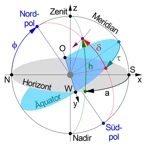 - ↑ Using the formulas of: Oliver Montenbruck, Thomas Pfleger: Astronomie mit dem Personal Computer, Springer-Verlag Berlin Heidelberg GmbH, 1989, ISBN 978-3-662-05865-7