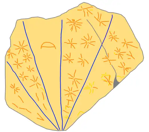 The representation is divided radially into five roughly equal-sized segments with an angle of a good 20 arc degrees each by four straight lines. The lines have a common point of intersection a little outside the board and start radially from the corner point to the left of the longest and straight edge. Star-shaped symbols are shown in the two segments on the left and right. A single star symbol can be seen in the left segment, and several star symbols in the other three. The middle segment shows a semi-circular figure, the straight edge of which is perpendicular to the direction towards the centre of the radial rays and on the side to this centre. The two right segments are traversed by a much more pronounced furrow.