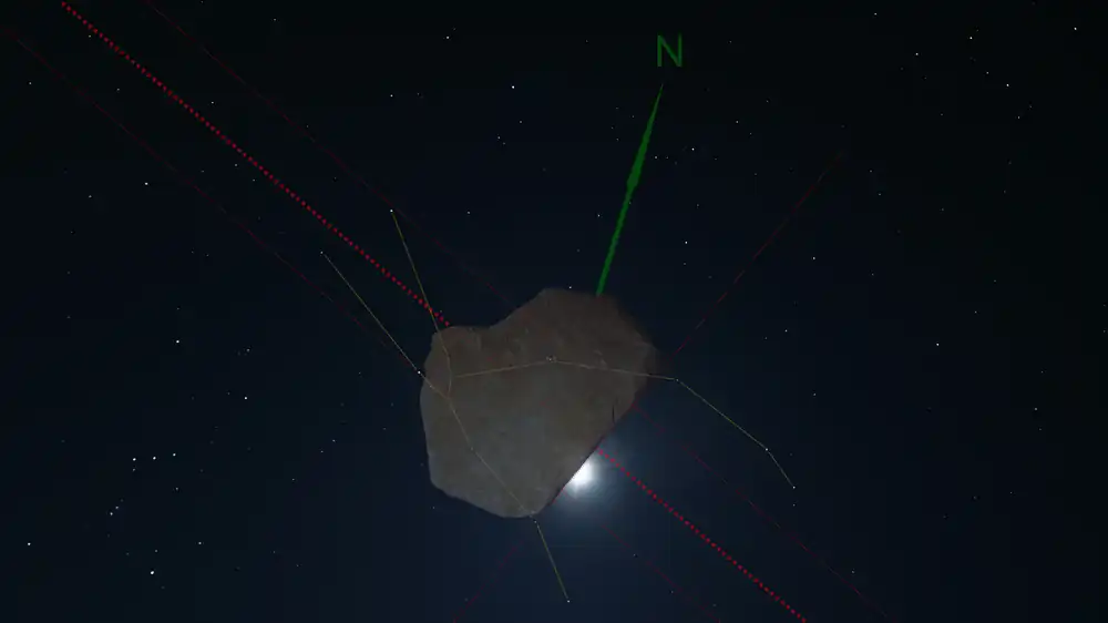 The azimuth (horizontal angle) of the still recognizable axis in the temple points east to 76 degrees of arc (direction to sunrise on April 18 and August 24) or in the opposite direction to the west to 256 degrees (direction to sunset on February 17 and on October 24). In Malta there are good astronomical observation conditions due to the dry and balanced Mediterranean climate. There, lunar eclipses were regularly observed, but also total solar eclipses, such as the solar eclipse in the morning hours of May 18, 2146 BC, with high probability.[2]