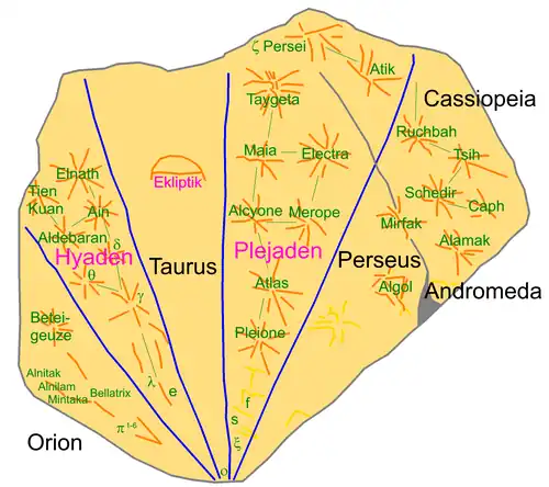 The bright red giant Aldebaran is at the left notch of the sky tablet, the rear foot of Perseus (ς Persei and Atik) at the upper small arc of the celestial table, ο Tauri at the bottom corner of the celestial table and Bharani (41 Arietis or also Nair de Butein) at the right corner of the celestial table.