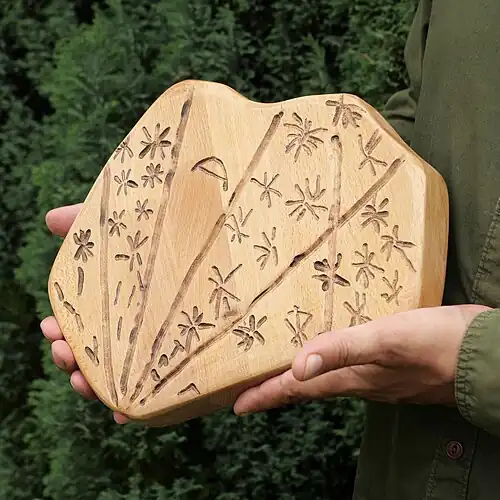 It is unclear whether the limestone slab found is largely complete or just a fragment of a larger slab, but some of the sides are noticeably straight and smooth.[8] The limestone slab has the shape of an irregular hexagon, is 29 centimetres wide, 24centimeters high and approximately 5 centimetres thick. Limestone is not very hard and can therefore be easily worked and scratched, and numerous symbols and graphic elements are represented on the flat surface. However, there are also many natural bumps and it is not always possible to clearly identify whether the surface has natural, deliberately man-made, unintentional or damage-related structures. The provenance of the stone tablet has apparently not yet been investigated, for example based on the chemical analysis of the composition of the rock.