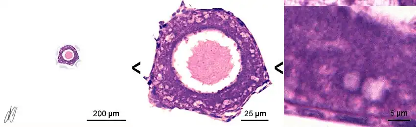 - increase of thickness of the zona radiata (~5 µm); note its radiant appearance;