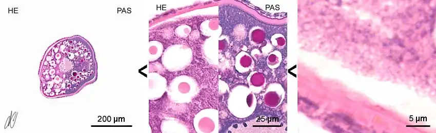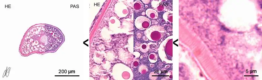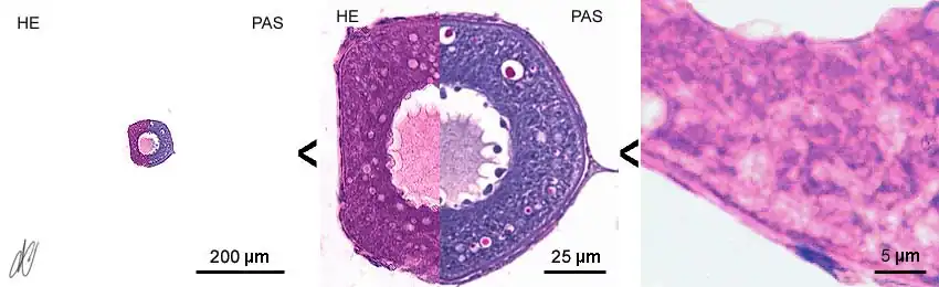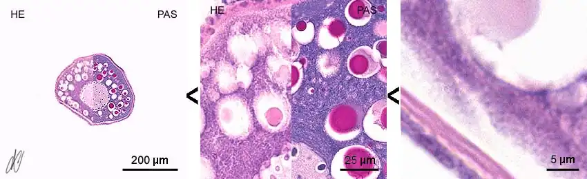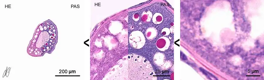 - initial endogenous vitellogenesis, visible as small chromophobic or slightly eosinophilic vacuoles in a zone in the cytoplasm, halfway the nucleus and the cell membrane; such yolk vesicles or intravesicular yolk is strongly PAS positive;
