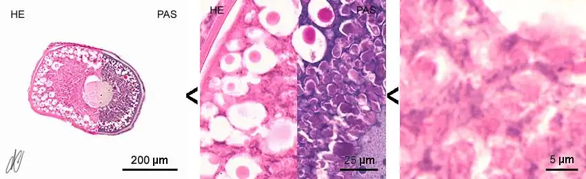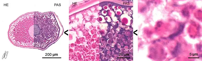 - ongoing endogenous vitellogenesis, with larger chromophobic vacuoles (PAS positive) in a central zone in the cytoplasm;