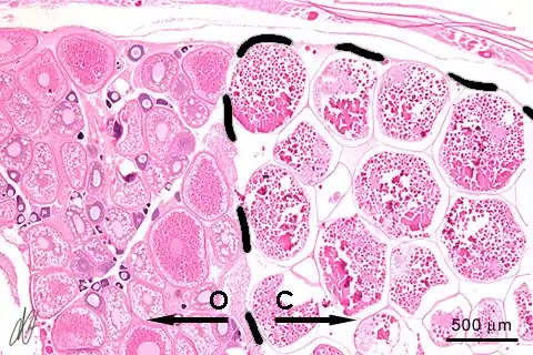 In a further (prespawning) stage shown here, mature oocytes have ovulated and are collected in the caudal oviduct [C enclosed by dotted line]. This image is suggestive of a prespawning stage. |