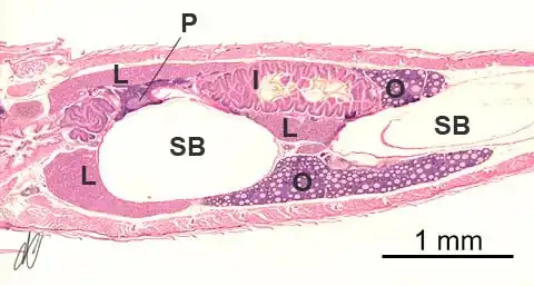 | The ovary [O] is a paired organ, located bilaterally between the abdominal wall and the swim bladder [SB]. At the level of this section, the ovary is further bounded by the liver [L] and intestines [I]. Part of the pancreas [P] is located in the anterior peritoneal cavity, between gut, liver and swim bladder.