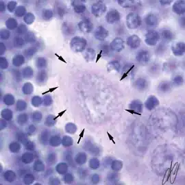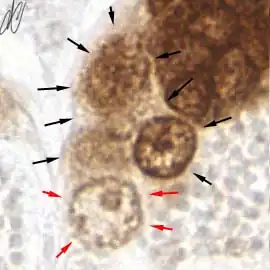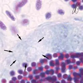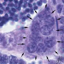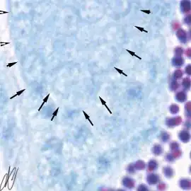 1. spermatogonium A (SgA) [arrows]: large single cell, with a large hypochromatic nucleus; early spermatogenic stages do not stain with Putt's carbol fuchsin. SgA divides mitotically to renew itself and to produce: |