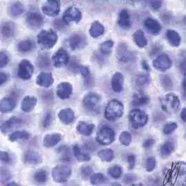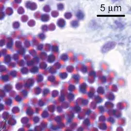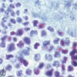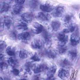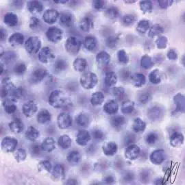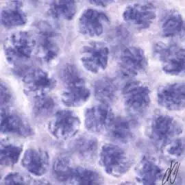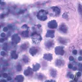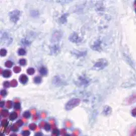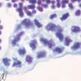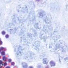 7. spermatocyte, leptotene stage of meiotic prophase, progressing to the zygotene stage; Note that there is staining with Putt's carbol fuchsin from this stage on, although still faint here. |