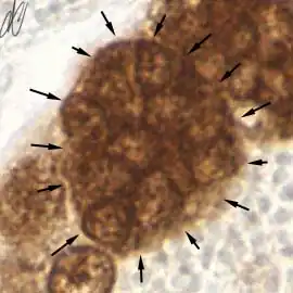 4. late spermatogonium B: smaller than early SgB, clusters >4 cells [arrows in left image]; there is high mitotic activity, as indicated by the strong PCNA immunoreactivity [arrows in right image]. |