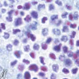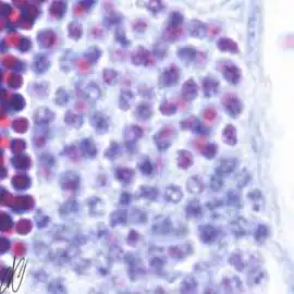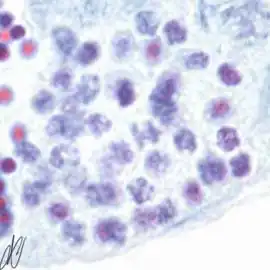 3. early spermatogonium B (eSgB) [arrows in left image]: morphologically indistinct from SgA, appears in clusters of 2-4 cells; there is moderate mitotic activity in spermatogonium B, as indicated by PCNA immunostaining [arrows in right image]; in contrast, there is only very light PCNA immunostaining in the single spermatogonium A cell [red arrows in right image]. Early SgB divide mitotically to produce: |