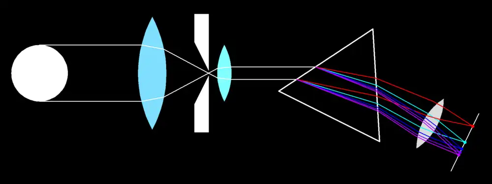The position of these lines on the screen of an optical spectrometer depends on the angles of refraction of the glass prism used or on the properties of the diffraction grating used, which depend on the wavelength of the light examined. The angles of refraction achieved are thus determined by the geometric arrangement in the optical devices used.