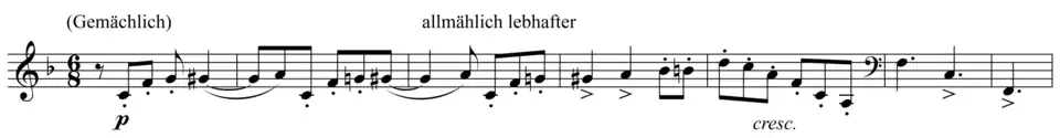 The beginning of the composition is notated in F major, and the five notes of the Till Eulenspiegel motif are c - f - g - gis - a. They are repeated twice: