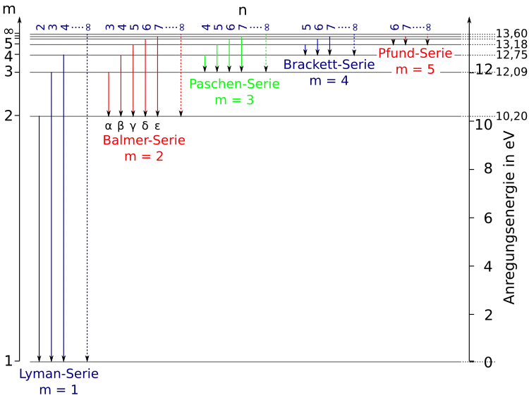 Quantum mechanics explains how the hydrogen atom glows. It goes from the state to the lower state with . The energy is thereby transferred to a photon whose frequency lies in the spectral series and can be determined with the following Rydberg formula: