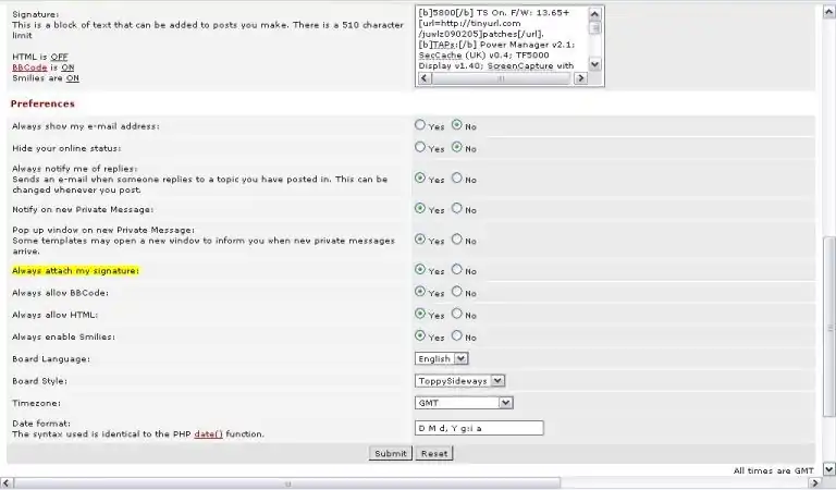 The most effective way to include the basic information about your setup (and save you forgetting something or endlessly repeating yourself) is to set up a signature. To do this, click on the Profile link at the top of the forum page and scroll about halfway down where you'll see the signature box. Type or paste in here information about your Toppy. As a rule, you should include at least the following information: