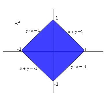 ![{\displaystyle B_{1}{\bigl (}(0,0){\bigr )}={\Big \{}(x,y)\in \mathbb {R} ^{2}:d{\bigl (}(x,y),(0,0){\bigr )}<1{\Big \}}={\Big \{}(x,y):{\bigl \|}(x,y)-(0,0){\bigr \|}_{p}<1{\Big \}}={\Big \{}(x,y):\|(x,y)\|_{p}<1{\Big \}}={\Big \{}(x,y):{\sqrt[{p}]{|x|^{p}+|y|^{p}}}<1{\Big \}}}](../_assets_/eb734a37dd21ce173a46342d1cc64c92/b8ebf9c0bf5f2d66d2fe08844d3548e60e3a9868.svg)
