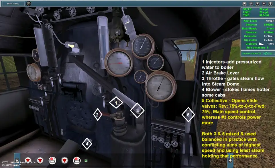 Cab mode involves operating locomotives from their cabs and pulling levers and pressing switches for reversers, regulators, brakes and other controls, just like on a real locomotive. Instead of the DCC dial you get the Heads Up Display, which displays useful information such as throttle position, brake position and brake pipe pressure. Driving locomotives in cab mode is discussed in detail elsewhere in this Wikibook.