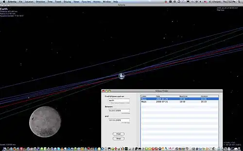 Another great feature of Celestia is the eclipse finder. Celestia will display all the eclipses during a period of time specified by the user, and give students the option to go to one of the eclipse dates and view what the eclipse looks like out in space. For example, the picture on the left shows a solar eclipse from the perspective of the moon with the earth ahead and the sun directly behind. Never before has such an opportunity existed for the naked eye. |