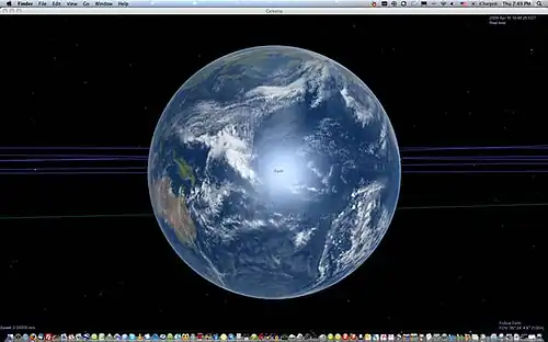 Celestia will start up in a window, and if everything is working correctly, you'll see Earth in front of a field of stars. Displayed on-screen, is some information about your target (Earth), your speed, and the current time (displayed in Universal Time, so it'll probably be a few hours off from your computer's clock).