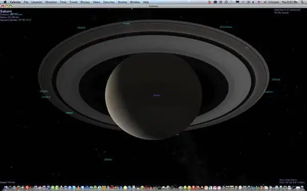 Color-coded labels make it easy to see what students are looking at in Celestia. For instance, planet names are blue, and moons are green. The picture on the left shows a view of Saturn and all of its moons. From that view it is difficult to see the moons apart from the surrounding stars, so the green labels help point out exactly where Saturn's moons are. |