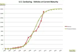 Because formal carsharing is a relatively new phenomenon, the data has not yet reached a full birth, growth, maturity and decline cycle. The number of vehicles in the U.S. that are owned by carsharing companies is just beginning to grow rapidly. Using this data in a three-parameter logistic function, a projected life cycle was established. S(t) = K/[1+exp(-b(t-t0)] where: