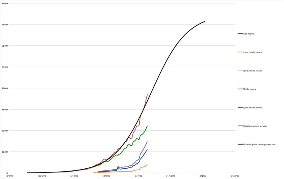 Whilst commercial aviation has undergone significant growth over the last half century, year-on-year percentage increases are slowing, suggesting that the technology of commercial flight is within the early stages of the maturity phase. Data has been obtained and is shown.[2] [3]. S-curve modelling is also undertaken, in an attempt to further understand the phase of commercial aviation, and provide insight into the future growth.