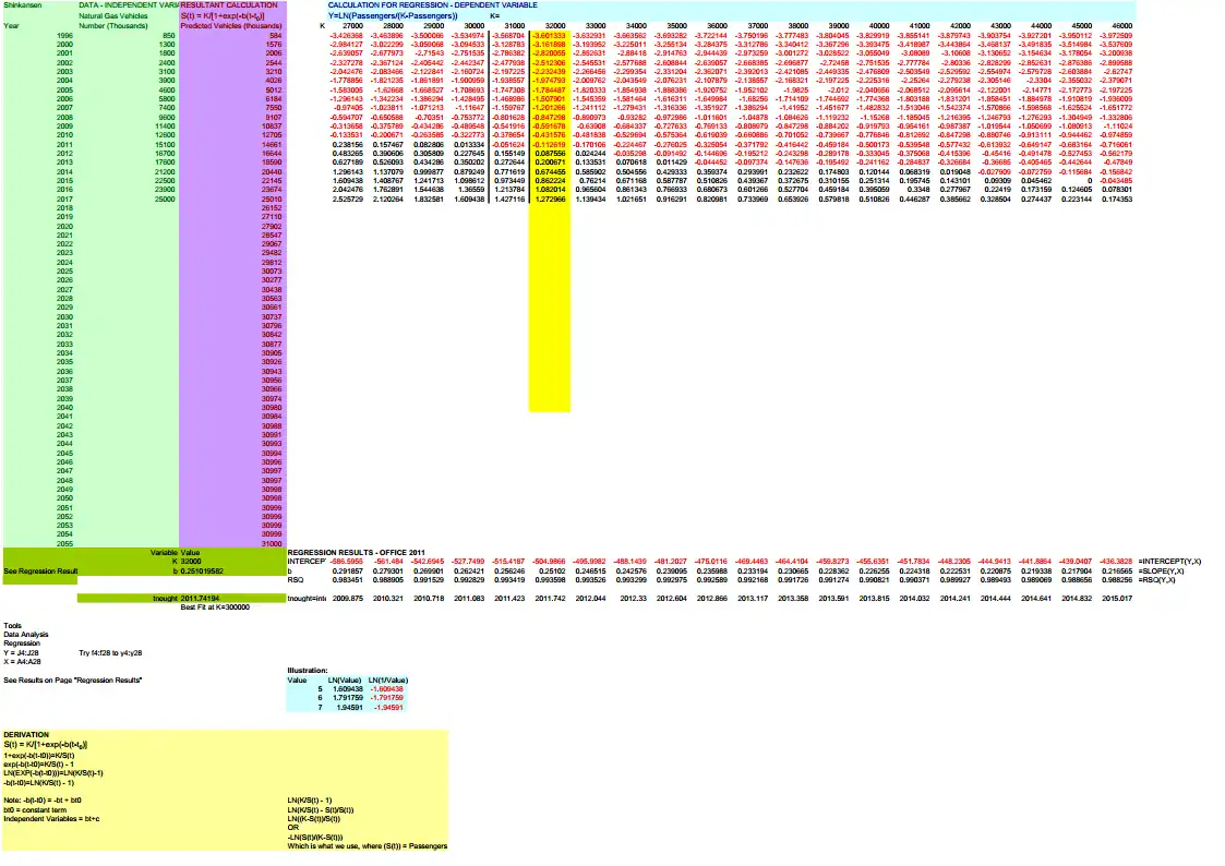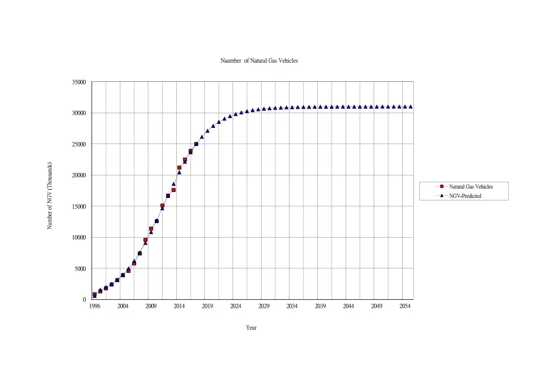 We can further forecast the year and predicted number of natural gas vehicle until S(t) reaches 32000, which is in the year of 2055. The S-curve is then show in figure 1.