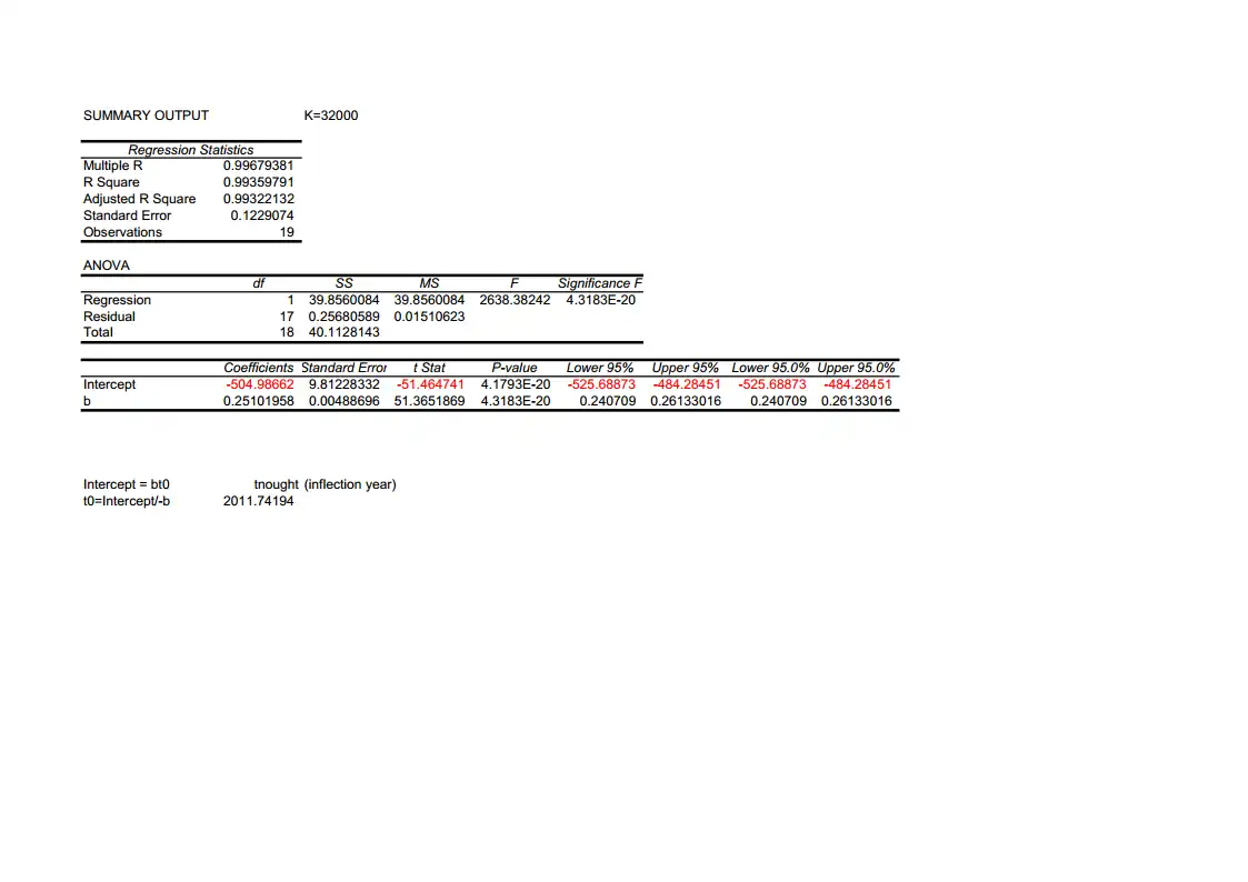 The logistic equation expect to have stability, symmetric and stimulation. For stability, the curve fits the data very well before year 2018. The model is quite correct with the value of R square for K=32000 are nearly equal to one. This is with less than 6% and is quite right. The t-statistic value is 51, which is a lot higher than 2 which guarantee the result is correct and significant at least for 95%. The t-statistic is the ratio of the departure of the estimated value of the number of vehicles from its predicted number of vehicles to its standard deviation of sampling distribution. The graph also shows that the red curve stays pretty close to blue curve. This means that the real and predicted numbers of vehicle are in a correlated and similar shape. The curve stays still in asymptotic of S(t)=31000. The curve also have a symmetry of t0 = 2011.74194 when the number of natural gas vehicles half the overall saturation value. The Stimulation of the curve also occurs as the deployment time decreases with time. This is a fact in the curve since the number of vehicles depends on the duration taken between the start time rather the effect of same duration and different start time.