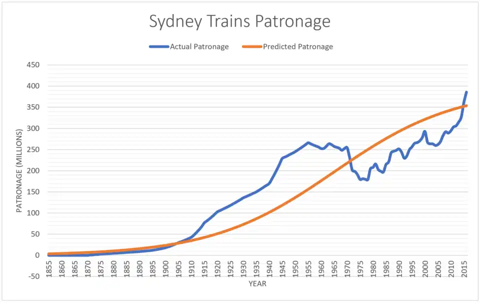 This report seeks to analyse the historic life cycle of Sydney Trains. This would include the context around its first deployment, as well as any major alterations to its network as it adjusts to new market and technological developments. There will then be both qualitative and quantitative analysis, observed against typical growth decline trends present in transport modes. With patronage data over the years, a direct comparison to a logistical three parameter function detailing expected patronages over the years would help identify precise dates of birthing, growth and maturity. A parameter for curve of best fit will then suggest the normality of growth of Sydney Trains, and an explanation as to why the parameter gave such a value will be detailed.