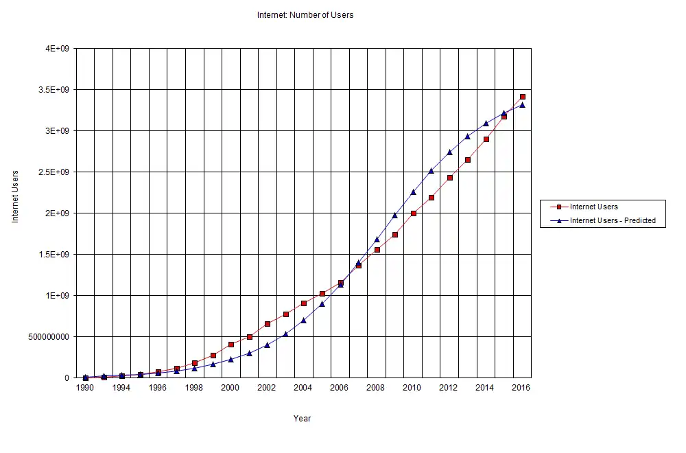The values used for the real values of internet adoption are taken from World Bank Data which acquired this data from the ICT Development Report by the International Telecommunication Union[4]. The data acquired was in the form of a yearly percentage figure which was then multiplied by yearly world population statistics acquired from Worldometers.info which elaborated on data by the United Nations, Department of Economic and Social Affairs, Population Division. All the data was then rounded using Excel's Integer Function to reach a result that would reflect real world populations (as the number of humans can only be a whole number).