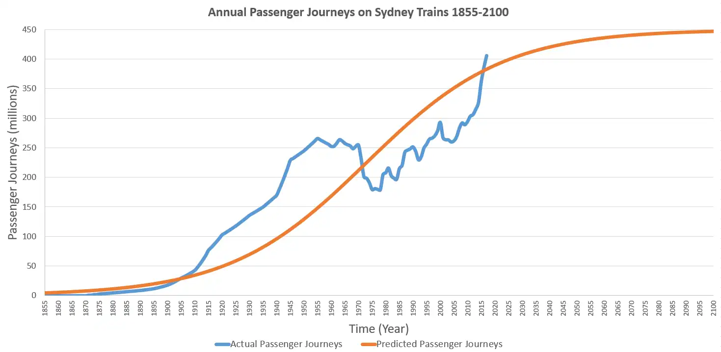 The S curve predicts that the number of passenger journeys will reach 450 million by the year 2100. The S curve also helps affix the dates of the various phases encountered in the life span of Sydney trains. These are summarised in the table below. Sydney trains has the second most expensive ticketing system after London and this coupled with the introduction of future projects such as the Sydney Metro Northwest, Sydney Metro CBD & Southwest and the planning of Parramatta link suggests that these will ease the congestion of passenger journeys on Sydney trains and effectively reduce it. While the S curve provides a good fit of the current trend there is a possibility that the introduction of a new technology coupled with future changes in regulations (keeping in mind that elections are around the corner) would significantly impact the number of passenger journeys over the years. While the S curve provides a good prediction of the annual number of passenger journeys in the short term, it does not account for policy changes and technological innovations in its future prediction and hence it does not provide a good approximation for the future predictions.