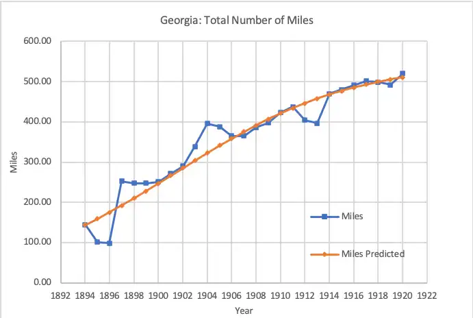 Four different streetcar systems were found to be used int Georgia between 1894 and 1920, being the horse or mule-drawn, steam-powered, electric and gas/petrol engine powered streetcar. Although battery powered was another method used in some systems, they were not found in this area in this timeframe. The overall analysis was split up between these four systems, however, only the electric system (as well as overall) showed a clear trend for birth, growth and maturity. The graph displaying the measured and predicted track mileage for all streetcar systems in total, and the estimated parameters can be seen in figure 1 and table 1.