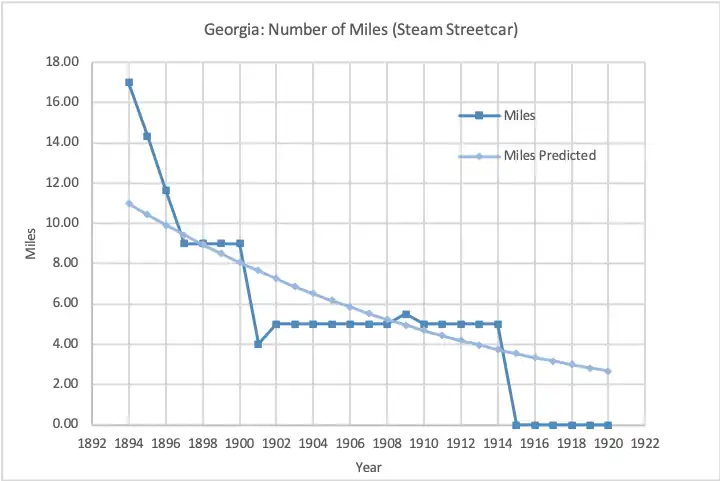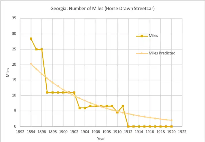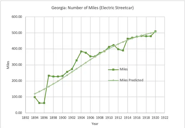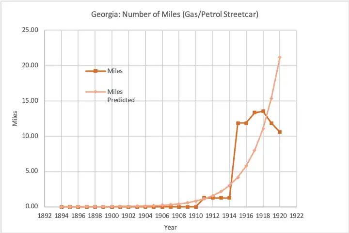 Transport modes, like most forms of technological advancement follow a trend of birthing, growth, maturity, and sometimes, decline. This lifecycle allows for the modelling and prediction of how a technology may behave or advance over time. The streetcars systems located in Georgia were tracked and recorded from 1894 to 1920, with a logistic function applied to model the predicted lifecycle of the transport mode.