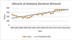 As the graph shows, it can be seen the actual miles in Alabama experienced a period of fluctuation which may because of the loss of data collected. The total trend of actual and predicted miles of the track both increased. In 1914, the miles of track reached the peak point, and then it declined and gradually became flat.