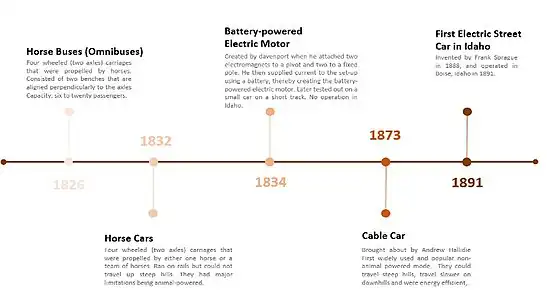 The history of streetcars in the US dates back to the early 19th century with the introduction of omnibuses (horse buses). Omnibuses were a type of carriage that had two axles and four wheels and was usually drawn by 2 horses (Charleston County Public Library, 2017). They followed predetermined schedules and travelled along pre-determined routes. Before omnibuses existed, passengers would walk to places by foot, and were hence limited by their physical stamina. The invention of omnibuses spared passengers fatigue and allowed them to carry cargo from one place to another. Unlike the rest of the inventions, omnibuses were not a result of technological innovation, rather they were a result of the evolvement of existing offerings (Charleston County Public Library, 2017). As new street rails and railways started developing, streetcars driven by horses became a smoother and faster alternative. Due to the growth of railways and track laying, horsecars could now operate on specific routes without interfering with other traffic. However, animal-powered transport had a lot of issues: they needed a great amount of care which required significant effort (Cameron, 2017), their manure polluted the streets (Morris, 2007), and they had a high operating cost (which meant they were out of reach for working class individuals). In 1873, a source claims that Andrew Hallidie witnessed the torture of horses while they struggled to pull carriages in areas with steep topographies and wet cobblestones, which mainly prompted the innovation of his steam engine-powered system. The rail system was cable driven and constituted of long cables that went through slots and passed over steam shafts located in powerhouses (Britannica, 2018). One of the major disadvantages of cable cars was that they all travelled at a constant speed, hence any malfunction that occurred resulted in shutting down the entire route Furthermore, as demand for cable cars increased, more construction of powerhouses was needed. This required a lot of investment from the government and communities and was not financially feasible (San Francisco Municipal Transportation Agency, n.d.). Despite no evidence that cable cars were used in Idaho, the limitations of cable cars prompted the invention of electric streetcars in 1888, and a streetcar system then opened shortly in Idaho in 1891 (Casner, 2002). It is important to note that in 1834, Thomas Davenport had created the battery-powered electric motor which led to the electrification of streetcars (Britannica, 2018). The electric streetcars worked very similarly to the cable cars but were powered by electricity via electric poles (trolley poles) that were connected to overhead wires rather than powered by mechanical pulleys (Dell et al., 2014).