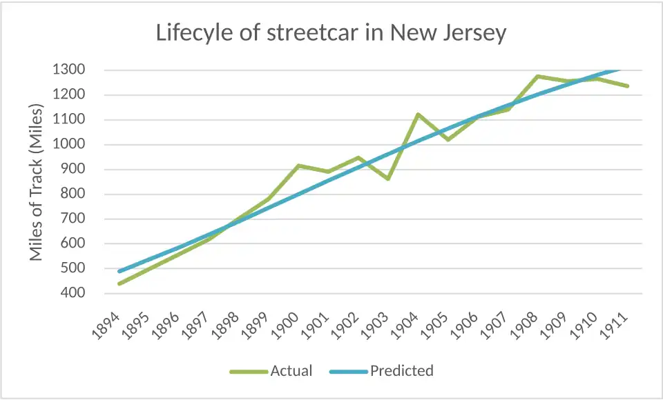With a comprehensive record on each streetcars company in United States which sorted by annual record inside the McGraw Electric Railway Manual, we are able to conduct the below table to analysis the mile of streetcar track in New Jersey of a yearly basis. The manual consist a range of details on each streetcars businesses between 1894 to 1911