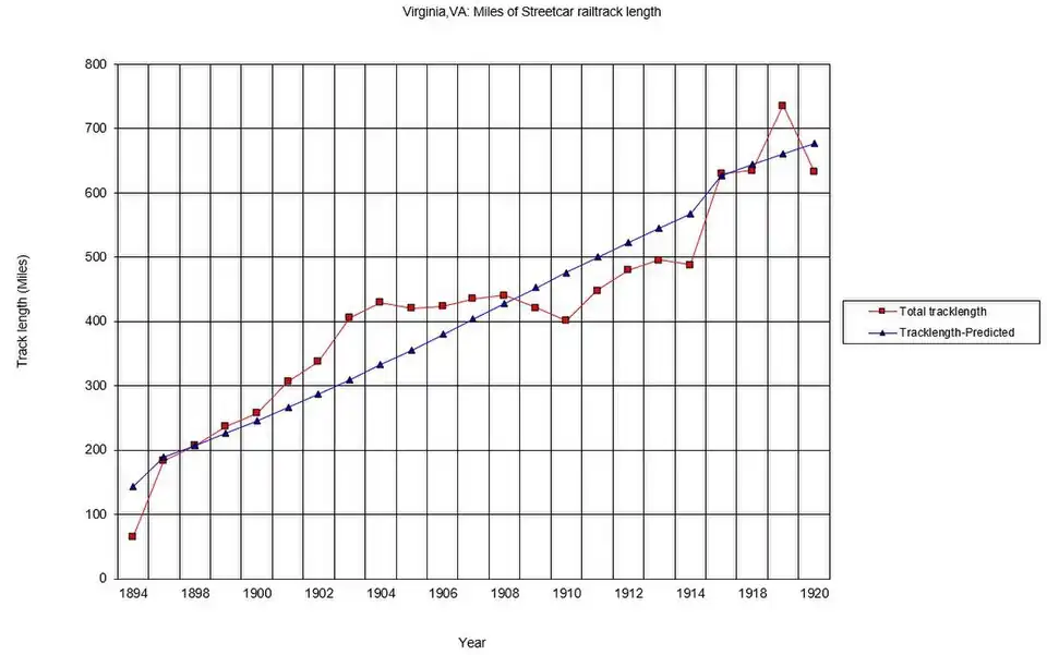 Apart from the analysis of the lifecycle of the state-wide streetcar system, individual streetcar systems within each urban area was also supposed to be undertaken. However, the extensive consolidation of streetcar operators due to the economic and political pressure of the railroad companies in Virginia also caused subsequent attempts at S-curves poorly fitting due to having insufficient or incomplete data to undertake a meaningful lifecycle assessment at an individual system level. Even if they were done, the results will not show well as the streetcar railroad companies did not experience a natural growth expansion, but experience sudden growth and losses, making it a numbers game and defeating the purpose of modelling for their futures.