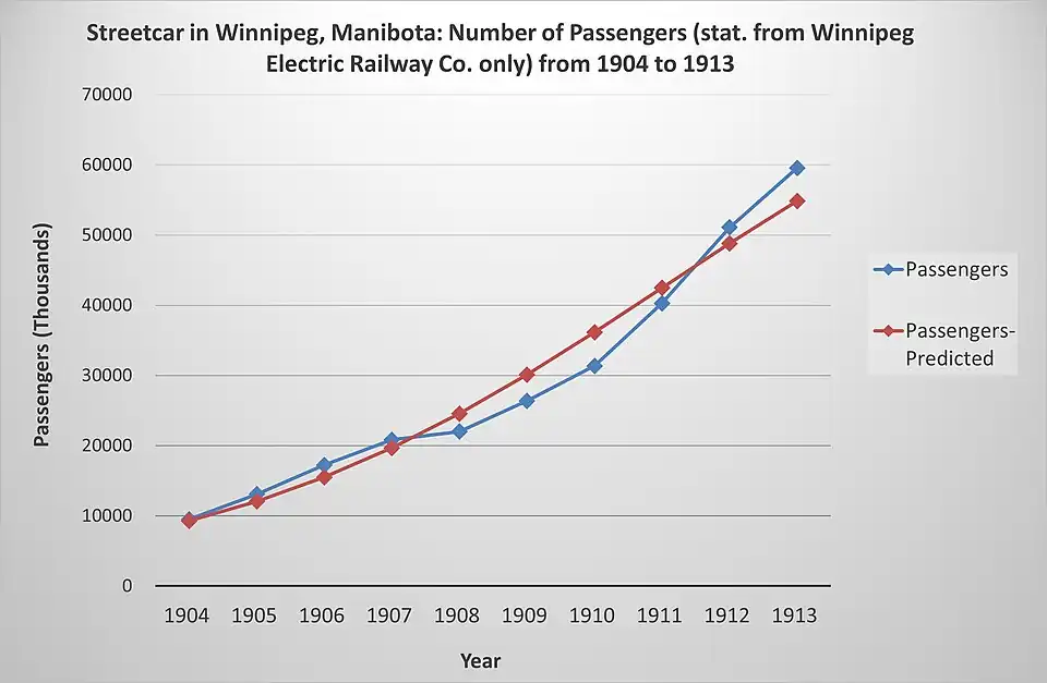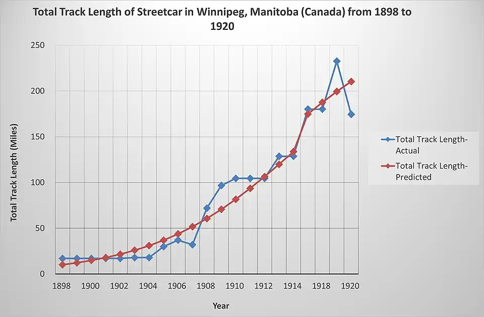 Overall, both prediction for both total track length and passenger carried in Winnipeg are quite accurate. However, we don't have enough actual historical data after 1920, so it may affect the accuracy the the prediction curve. Especially the curve shows the inflection time is 1911 or 1914, but actually in the real history, the streetcar system in Winnipeg declined since 1930.
