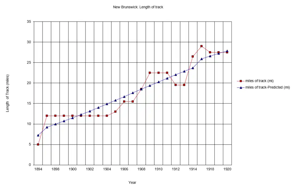 'McGraw Electric Railway Manual – the red book of American street railway investment' give access to several valueable data of all the streetcar systems in the US and some of its neighbors between 1894 and 1920. Table 1 shows the length of tracks of each streetcar system in New Brunswick in that period:
