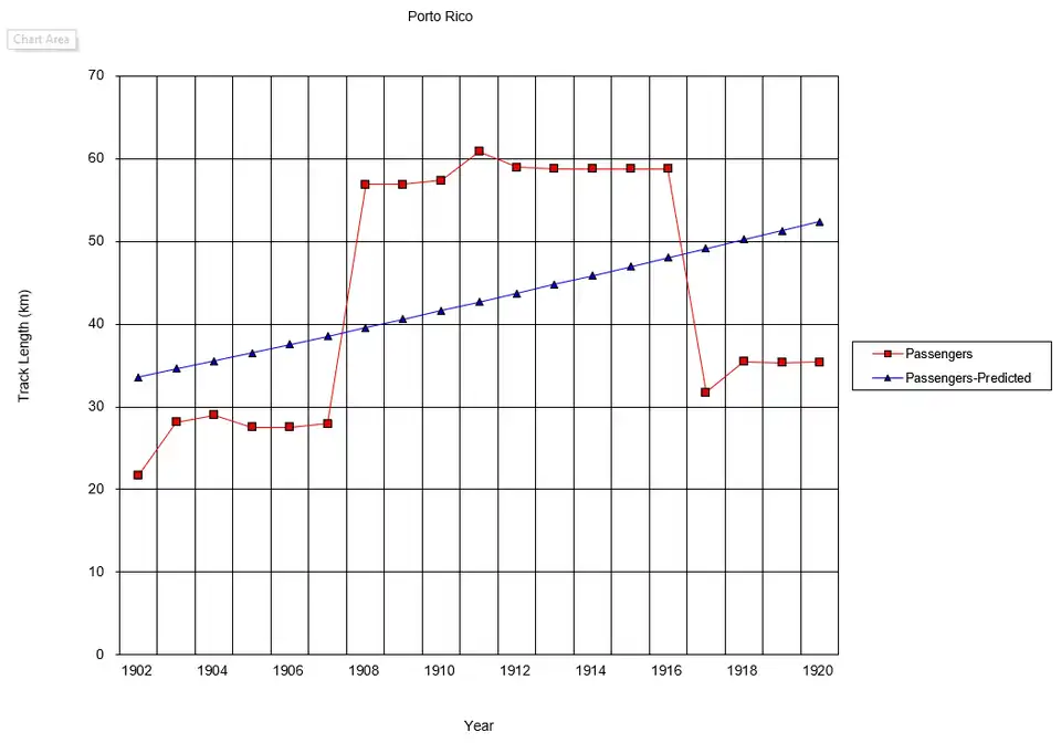 The railway system in Puerto Rico was heavily affected by World War 1 in 1914. Tracks were significantly damaged, requiring reconstruction and recovery to revive the entire streetcar system. However, some tracks were not economically viable to be reconstructed, resulting in a considerable drop in track length after 1914.[7]