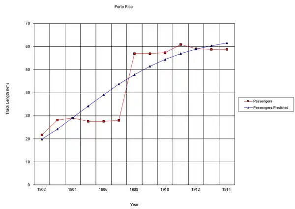 A quantitative analysis was conducted on the growth of the streetcar system in Puerto Rico. The parameter focused on in this analysis was the track length of streetcars recorded in the McGraw Electric Railway Manual - The Red Book of American Street Railway Investment. The earliest record of streetcar tracks dates back to 1902. However, streetcars were already established in Puerto Rico in the 1880s during the Spanish colonization era. Puerto Rico was surrendered to the United States after the Spanish-American War in 1898. The streetcar system before the surrender was managed by Spanish investors who never submitted their information to the McGraw Electric Railway Manual. Therefore, the analysis only includes streetcar systems with records in the McGraw Electric Railway Manual.