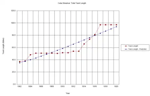 A quantitative analysis of the Cuban streetcar network is performed to overview the life-cycle of the streetcar system in Cuba. In this analysis, sufficient streetcar railway length in miles by years is required and only Havana Electric Railway, HER in Havana provided enough data to perform an analysis. The data is sourced from McGraw Electric Railway Manual - the red book of American street railway investment from 1902 to 1920[11] and the few missing data were estimated using linear interpolation.