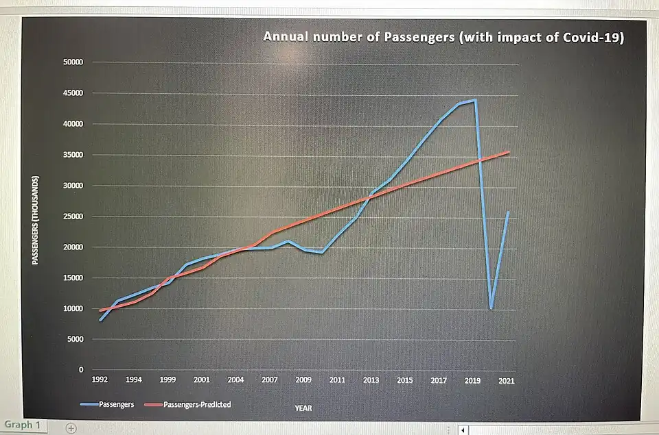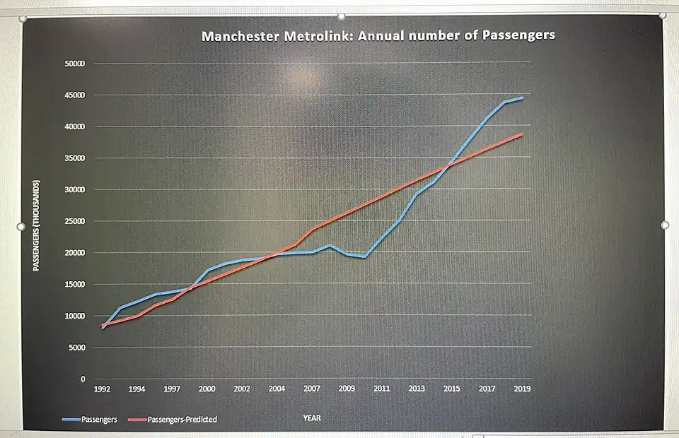 The Manchester Metrolink passenger statistics for each year from 1992 to 2021 are available from the UK Government's Transport Statistics for Great Britain. [13] In order to predict the number of passengers from the raw data, the following formula was used.