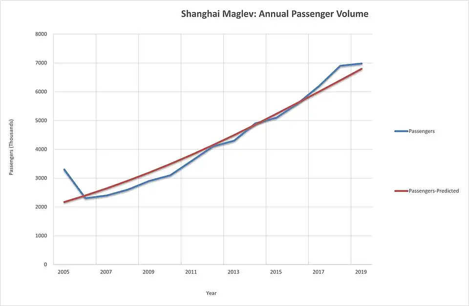 The prediction is appropriate. From 2005 to 2019, it had a clear period of growth and a mature stage of its life cycle. However, because the research period was so short, there were no clear signs of growth and decline. From 2005 to 2006, the passenger traffic volume of Shanghai Maglev significantly decreased in the first year of its operation and then increased steadily. The growth stage of Shanghai is from 2005 to 2019. After 2018, it will enter the mature period. The decline stage lasts longer than the time range that was measured, and there is no clear sign of decline in the graph. Although the decline period of Shanghai Maglev is not shown in the quantitative analysis. However, as an alternative to the original high-speed rail network, it has now been reduced to a part of the urban rail transit, and the subsequent maglev construction plan has also been cancelled one by one. This means that the maglev train will definitely become less popular as a way to get around in China.