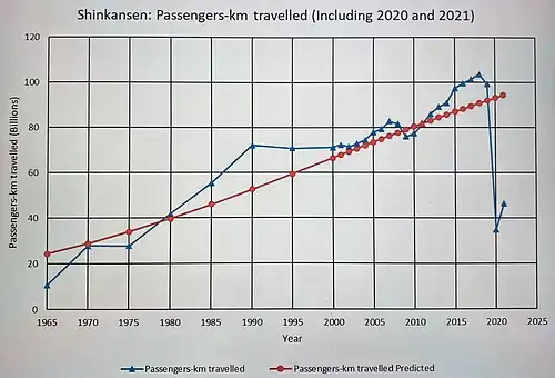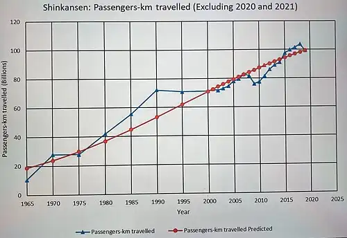 - ↑ a b The Ministry of Land, Infrastructure and Transport, Japan. (n.d.). Shinkansen ryokyaku yusouryou no suii [The change in the number of passengers carried by Shinkansen]. https://www.mlit.go.jp/common/000232384.pdf
