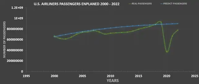 The following excel reperents the "Actual and projected recorded of annual enplaned U.S. airliner passengers from 1926 to 2022".