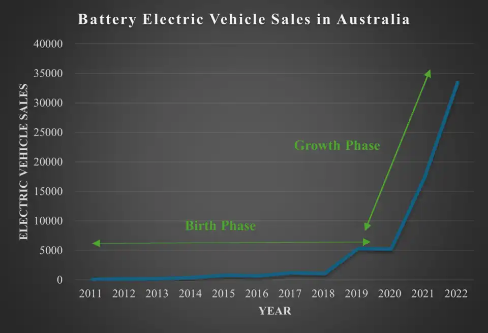 The graph shows that in case of Australia the period from 2011 till 2020 can be taken as birth phase of electric vehicles in Australia. The recorded sales in 2020 was slightly less than in 2019. COVID-19 might be one of the causes for this low value. The sales after 2020 shows a steep increase almost increasing to six and a half times in 2022. EV sales at the end of 2023 were not available in State of Electric Vehicle, 2023. But we can determine from the nature of graph that EV sales are in its growth phase. The saturation of EV sales is a matter of time in future.