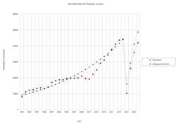 - ↑ a b "Passenger journeys on Manchester Metrolink 1992–2023 | Statista". Statista. Retrieved 2025-03-07.