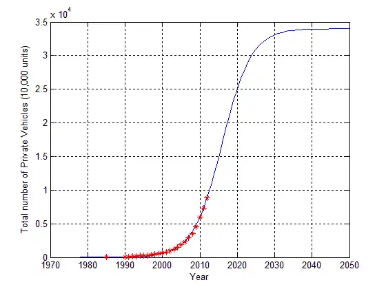 After a set of testing, the value of k here was chosen as 578000 (km). The model fitted by Matlab is following: