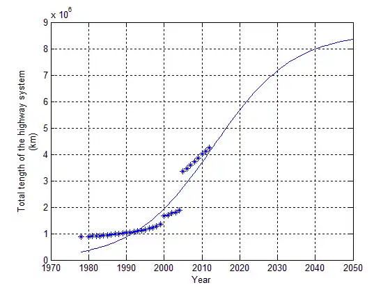 With the data of the total length of highway system in China, a model can be fitted to estimate the growth of this system. [7] The basic model is